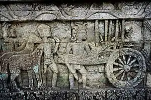 The Kakawin Ramayana (c. 870 AD), which is the Javanese version of Valmiki's epic Ramayana (c. 500 BC), mentions clothing and armor that reflect the era. A member of the royal family is said to wear crown, padaka (collar, medallion, or breastplate), karambalangan (girdle or plastron) and use gold-plated armor even in battle.[2]: 802 [3]: 27
