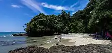 Karang Bolong Beach (Indonesian for "Holed Coral") is a white-sand beach on the island of Nusa Kambangan in Cilacap Regency, Central Java. Located on the eastern end of the island inside a nature reserve, the beach is situated near an old Dutch fortress, also known as Karang Bolong.