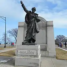 In 1911, a monument was raised to Havlíček in Chicago by Czech residents of the city in Douglass Park. The bronze statue by Joseph Strachovsky was cast by V. Mašek in Prague and shows Havlicek in a revolutionary pose, dressed in a full military uniform and a draped cape with his outstretched arm motioning the viewer to join him. The statue was moved to Solidarity Drive on today's Museum Campus in the vicinity of the Adler Planetarium in 1981.[3]