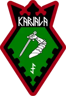 In October 2023, as part of a rebranding effort, the unit changed its insignia again. The current insignia drew inspiration from the Academic Karelia Society, displaying an arm with armour plating and a shield. The wolfsangel, inscription, and the colours of the insignia were retained. The insignia preserves the "Karjala" inscription, the Karelian color scheme, and the Wolfsangel, resembling a rotated version of the symbol used by the 34th SS Volunteer Grenadier Division Landstorm Nederland.[14]