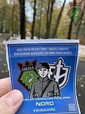 In a report featured by Iltalehti, a sticker associated with the Karelian National Battalion was presented as a means of disseminating information about the unit itself.[8] The same sticker was also showcased on an Estonian website called "Koiduaeg," calling itself a "national news and opinions portal.".[19] According to the source, the sticker read "A new day has dawned. Karelia is rising, her own battalions are marching in line".[2] Moreover, the sticker also featured the insignia of the Russian Volunteer Corps,[8][2] a paramilitary unit consisting of Russian citizens and has been deemed as a far-right organisation[20][21] - suggesting a shift in alignment to the Russian Volunteer Corps after the severing of ties with the Karelian National Movement. The sticker also has a link to the official Telegram page of the Karelian National Battalion page.