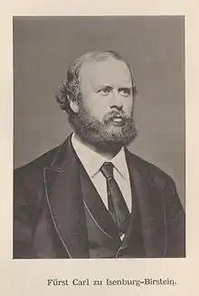 Karl II, Prince of Isenburg-Büdingen in Birstein (full name: Karl Viktor Amadeus Wolfgang Kasimir Adolf Bodo) (29 July 1838 – 2 April 1899) was head of the mediatised German house of Isenburg and Büdingen.