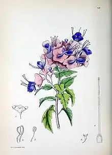 Branchlets woody, terete, shortly and softly pubescent, marked with pale lenticels ; internodes about 2 cm. long. Leaves broadly ovate, triangular at the apex, broadly wedge-shaped at the base, 2-5-4 cm. long, 2-3 cm. broad, coarsely crenate, with few (about three) rounded teeth, very shortly setulose above, paler below and conspicuously glandular and shortly pubescent ; lateral nerves about three on each side of the midrib ; petiole 7 mm. long, densely pubescent. Flowers few, arranged in axillary cymes about 4 cm. long ; peduncles slender, softly pubescent; lower bracts more or less leafy, spathulate-obovate, up to 7 mm. long; pedicels up to 1.2 cm. long, with two small opposite linear bracteoles above the middle. Calyx pink-coloured, gradually enlarging, broadly top-shaped, glandular-pubescent outside; tube 1 cm. long, with broadly rounded lobes, the latter rigidly membranous in the fruiting stage and expanding to 25 cm. Corolla purple, 2-2.5 cm. long, glandular and softly pubescent outside; tube up to 1.5 cm. long. Stamens long exserted; filaments glabrous. Ovary hairy in the upper part ; style a little longer than the stamens, slender, glabrous. Fruit truncate, 4-horned, included by the accrescent calyx.