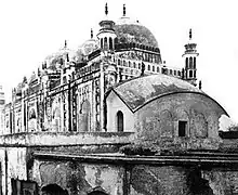 The Kartalab Khan Mosque or Begum Bazar Mosque, in the Begum Bazar area in old Dhaka, Bangladesh, was built by Nawab Diwan Murshid Quli Khan (alias Kartalab Khan) between 1700 and 1704.[2] The mosque consists of a high valuated platform, a mosque with a 'dochala' annex on the north upon the western half of the platform and a 'baoli' (stepped well) to the east of the platform. It is roofed by five domes resting on octagonal drums.[3] The mosque was extensively renovated by Mirza Golam Pir in the nineteenth century.[4] In accordance with Murshid Quli Khan's wishes, he was buried under the entrance to this mosque.