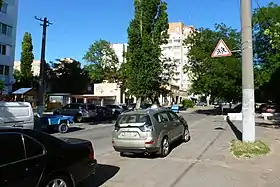 The two-storey, Soviet neoclassic house with columns and gates at Kartamyshevska 34 was built on the site of a sausage factory in 1952.[11] From 1947 to 1970, housing was built primarily for military families.