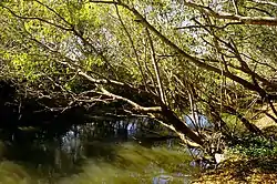 Evergreen forests of three kinds occur within Kasanka; Mushitu or swamp forest, riverine forests and very small patches of Mateshe (dry evergreen forest). The Mushitu is characterised by huge red mahoganies, waterberries and quinine trees among others and is fairly well represented. The largest tract of intact Mushitu, in the Fibwe area, hosts the annual gathering of straw-coloured fruit bats from October to December making it the largest fruit bat roost on Earth.[4] Riverine forests are found along most rivers in Kasanka, with the largest stretches being found along the Luwombwa. True Mateshe probably was common in historic times but is rare now, as a result of centuries of frequent fires. All forest types are at risk from frequent wildfires as the tree species they support are not resistant to fire.[5]