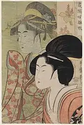 Kitagawa Utamaro (c. 1753–1806) made his name in the 1790s with his bijin ōkubi-e ("large-headed pictures of beautiful women") portraits, focusing on the head and upper torso, a style others had previously employed in portraits of kabuki actors.[4] Utamaro experimented with line, colour, and printing techniques to bring out subtle differences in the features, expressions, and backdrops of subjects from a wide variety of class and background. Utamaro's individuated beauties were in sharp contrast to the stereotyped, idealized images that had been the norm.[5]