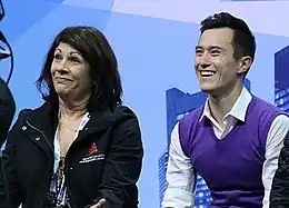 Kathy worked with Patrick Chan before his previous coach, Christy Krall, resigned in 2012.[1] Since that, Patrick Chan became two-time Olympic silver medalist in 2014 and World Champion in 2013 during the partnership with Johnson. She resigned in August 2016.[2] Kathy helped Patrick to create his programs. For example, Patrick told his short program ″Dust in the Wind″ was conceived during partnership with Johnson.[3]