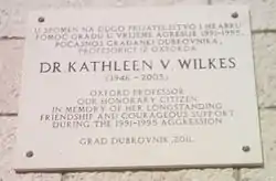 Wilkes became Chairman of the executive committee of the Inter-University Centre in Dubrovnik in 1986. Concerned at the lack of voice for philosophers in the east who were interested in the analytic approach, with Bill Newton-Smith as her co-editor, she created a journal known initially as the Dubrovnik Papers, and now flourishing as International Studies in the Philosophy of Science. She paid for a young Croatian psychologist's education at Oxford, maintaining throughout that the fees were being met by a fictitious 'Alington trust'. During the siege of Dubrovnik by the JNA in 1991–1992 during the Croatian war of independence, she refused to leave, seeing it her duty to give comfort and support to the sufferers and to inform the world of the City's distress.