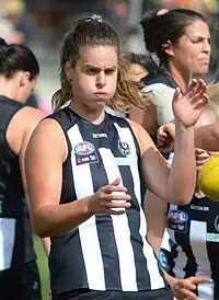 Lynch was drafted by Collingwood with the club's second selection and the 11th pick overall in the 2018 AFL Women's draft. The coach Wayne Siekman said that she's "a tall, big bodied midfielder who can also push forward. Katie uses her size to her advantage to win the ball and also push the opposition off. She has a very damaging left foot kick that rarely misses the target."[8] She made her debut in a loss to Melbourne at Victoria Park in round 2 of the 2019 season.[9][10] Following her debut, Lynch played in all six of the remaining matches of the season.[11]