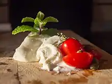 Katiki Domokou (Greek: Κατίκι Δομοκού) is a cheese made of goat and sheep milk. Its origin is from Domokos in Phthiotis prefecture.[1] It has white color. It is a soft cheese with low fat content. The average nutritional value of 100 gr of the product is 169 kcal, 10 gr proteins, 3 gr hydrocarbons and 13 gr fats. It is a traditional product with protected designation of origin. It is made from pasteurised milk that curdles without rennet and it is drained in bags made of cloth.[2] It is available for sale in many supermarkets.