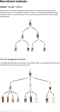 It was the original plan of Bonifacio to increase the membership of the Katipunan by means of sistemang patatsulok or triangle system. He formed his first triangle with his two comrades, Teodoro Plata and Ladislao Diwa. Each of them re-instituted Katipunan thoughts into another two new converts. The founder of the triangle knew the other two members, but the latter did not know each other. In December 1892 the system was abolished after proving it to be clumsy and complicated.[35] A new system of initiation, modelled after the Masonic rites was then adopted.[36]