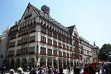 With an average of 12,975 passers-by per hour (as of 5 May 2011), Kaufingerstraße is one of the top-selling shopping streets in Germany. The rental and construction site purchase prices are the highest in the Kaufingerstraße than in any other street in Germany. Rental prices are around 300 € and site purchase prices around 50,000 € per square meter (in 2008). In 2008, the street was one of the 10 shopping miles (9th place) with the highest rents in the world.[1] In 2010, it was, with 11.905 passers-by per hour, in third place of the busiest shopping streets in Germany.[2] In 2011, the Kaufingerstraße slipped to number 4 of the most visited shopping streets in Germany behind the Zeil in Frankfurt am Main (13,035 passers-by per hour). Meanwhile, the Neuhauser road placed second in the list. According to a study by Jones Lang LaSalle (JLL), it was the busiest street in Munich with 13,515 passers-by per hour on the deadline. Also in 2013, the Neuhauser Straße placed second with 11,920 passers-by, this time behind the Dortmunder Westenhellweg (12,950 passers-by).[3] Because of this, Munich is the only German city, which has 2 shopping streets in the list of the most visited five.[4] According to an analysis by JLL from the year 2015, Kaufingerstraße is the most expensive shopping street in Germany with a top rent of 360 Euro per square meter.[5]