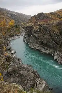 The Kawarau Gorge is a major river gorge created by the Kawarau River in Central Otago, in the South Island of New Zealand. The towns of Queenstown and Cromwell are linked by State Highway 6 through the gorge.[1]