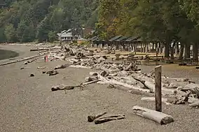 Kayak Point is a cuspate foreland on Port Susan, with a sandy beach that was derived from erosion of nearby bluffs.[36] The 660-acre (270 ha) park is largely undeveloped, with only 40 acres (16 ha) dedicated solely to recreational uses. Kayak Point County Park features a 3,300-foot-long (1,000 m) sandy beach along Port Susan with picnic shelters and parking. The beach is interrupted by a boat launch and a 300-foot-long (90 m) pier.[37] An open field is located adjacent to the beach and pier, featuring larger shelters and a playground. The park also offers overnight campsites, yurts, and cabins for rent.[38][39] The park, the most popular in the county system,[33] supports a variety of activities, including fishing, crabbing, windsurfing, hiking, and birdwatching.[37][40]
