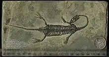 Keichousaurus (key-cho-saurus) is a genus of marine reptile in the pachypleurosaur family which went extinct at the close of the Triassic in the Triassic-Jurassic extinction event. The name derives from Kweichow (now Guizhou Province) in China where the first fossil specimen was discovered in 1957. They are among the most common sauropterygian fossils recovered and are often found as nearly complete, articulated skeletons, making them popular among collectors. Keichousaurus, and the pachypleurosaur family broadly, are sometimes classified within Nothosauroidea, but are otherwise listed as a separate, more primitive lineage within Sauropterygia.