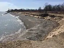 Aerial photos dating back to the late 1930s indicate that significant erosion has taken place over the decades.[5] But that erosion has been uneven. The north and south shorelines protected with large stone revetments have been stable. The larger central portion of the dunes, which is largely unprotected, has been badly eroded.