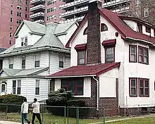 Throughout much of the 20th century, Kensington was seldom distinguished as a distinct neighborhood, with many residents and demographers identifying the area as the western section of Flatbush.[10][11][12][13][14][15][16] The descriptor West Flatbush was also used by various religious & civic organizations and urban planners in the first half of the 20th century before largely falling into disuse after 1954.[17][18][19] While the Kensington moniker continued to be employed by branches of certain governmental institutions (including the Post Office Department and the Brooklyn Public Library), it was also used by demographers to differentiate the largely working class, ethnically heterogeneous[20] tracts west of Ocean Parkway (then an upper middle class, predominantly Jewish American enclave roughly situated between the well-heeled residential thoroughfares of the Upper West Side and the more steadfastly middle class Grand Concourse in socioeconomic standing among New York City's Jewish American community at its late 1940s social apogee) from the historically affluent, Old Stock and Jewish American-dominated tracts east of Coney Island Avenue.[21] A 1945 fifteen-year retrospective study of Brooklyn Protestantism by the Committee for Cooperative Field Research included the Kensington tracts between the historical villages of Windsor Terrace and Parkville (alternatively characterized as the "Ocean Parkway corridor") within the boundaries of Flatbush, also noting that a contemporaneous survey of 3,072 families indicated that 41% of residents identified as Roman Catholic (exemplified by a recent influx of second and third-generation Italian Americans from South Brooklyn and other northern neighborhoods), 33% as Jewish (primarily concentrated in apartment houses on "main traffic ways") and 26% as Protestant, with the latter population remaining concentrated in "private dwellings on the side streets" amid an ongoing decline.[22] In his 2015 memoir, musician Marky Ramone (who resided at 640 Ditmas Avenue throughout much of his childhood in the 1960s) noted the area's distance from major thoroughfares in eastern Flatbush, necessitating a two-fare public transit zone via bus to Erasmus Hall High School.[23]