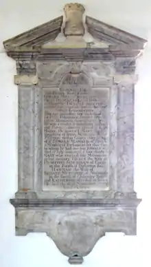 - ↑ His wife's sister, Hannah Hill, married Richard Nutcombe of Nutcombe in the parish of Clayhanger, Devon, according to the monument in Broadhembury Church to her father Richard Hill (1655–1737) of Kerswell Priory in the parish of Broadhembury, see image File:RichardHill OfKerswellPriory BroadhemburyChurch Devon Died1737.PNG