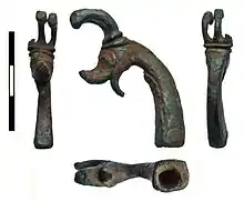 Some sources suggest the bowl was imported across the Irish Sea because the practice of producing bronze bowls using a spinning technique was done in the Belgae workshops of south-east England, and Roman continental workshops, rather than Ireland.[7][16] However the evidence for this conclusion is conjecture, and the Keshcarrigan bowl was just as likely made in Ireland.[17] A reasonably close parallel to the Keshcarrigan cup is a handled vessel of willow, presumably Irish origin, in the National Museum of Ireland, and another bronze handle from a similar profile cup was discovered at County Galway.[17] Conversely, though a similar handle was recently found in the Somerset hoard,[7] no other vessel of this style was found in southern Britain,[15] so the practice of making bowls with ornamental bird handles must have become established in Ireland sometime in the early 1st century AD.[18]