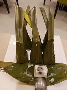 Khanom sot sai (Thai: ขนมสอดไส้, pronounced [kʰānǒm sɔ̀ːt sâj]), also known as khanom sai sai (ขนมใส่ไส้, pronounced [kʰānǒm sàj sâj]), is a Thai dessert with a sweet filling. It is made up of coconut and palm sugar, and the filling is covered with steamed rice flour mixed with coconut cream. It was used at Thai wedding ceremonies in ancient times. It is traditionally packed by wrapping in a banana leaf.