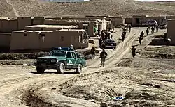 Afghan National Police patrol through a bazaar while on their way into the village of Bakshikhala, Kherwar District, Logar Province