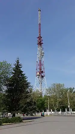 Kherson TV Tower (Ukrainian: Херсонська телевежа "Kherson TV Tower") was a 199 m (653 ft) tall steel space framed truss communications tower located in the Ukrainian city of Kherson.[2][3][4] The building was uniquely built, having been built by using the cross bracing system.[2] The tower was a truss TV tower, specifically, a Vierendeel truss tower, wherein a structure's members are not triangulated but form rectangular openings instead (see Vierendeel Truss).[2] The tower had an antenna that measured 199.95 m (656 ft) and a roof that measured 189.89 m (623 ft).[2][3] The tower possessed a total height of 200 m (656 ft), and was the tallest structure in the Kherson Oblast.[2]