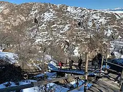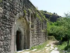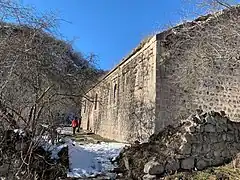 Khndzoresk is widely famous for its canyon with picturesque rock formations and ancient cave settlement. The artificial caves, some of which are currently used as stables and warehouses, used to be inhabited till the 1950s. In the bottom of the gorge there is St. Hripsime church, dating back to the 17th century. On a spur beyond on the right side of the gorge there is Anapat (hermitage) with the tomb of Mkhitar Sparapet. The cave church of St. Tatevos can also be found nearby.[3]