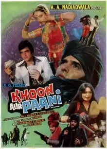 Khoon Aur Paani (transl.Blood and water) is a 1981 Hindi-language action film, produced by A. A. Nadiadwala under the A.G.Films Pvt. Ltd. banner and directed by Chand. It stars Feroz Khan, Jeetendra, Rekha, Parveen Babi and music composed by Laxmikant–Pyarelal.