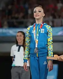 Pohranychna became age eligible for senior competition in 2019. She made her senior international debut at the Pesaro World Cup and placed fifth in the hoop final.[14] Then at the Tashkent World Cup she placed fourth in the all-around and also qualified for all four event finals.[15] In the event finals, she finished fourth in ball, sixth in hoop and clubs, and eighth in ribbon.[16] She won her first World Cup medal at the Guadalajara World Challenge Cup with a silver in hoop behind Russia's Alexandra Soldatova.[17][18] She then won the all-around silver medal behind Vlada Nikolchenko at the Ukrainian Championships.[19] Then at the Cluj Napoca World Challenge Cup, she placed sixth in both hoop and clubs.[20] At the World Championships in Baku, She finished fifth in the team competition alongside Vlada Nikolchenko and Yeva Meleshchuk.[21] She then finished twelfth in the all-around final with a score of 80.575, earning Ukraine a second quota for the 2020 Olympic Games.[22]