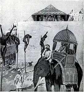 Khusrau was first brought to Delhi, where a novel punishment was meted out to him. He was seated in a grand style on an elephant and paraded down Chandni Chowk, while on both sides of the narrow street, the noblemen and barons who had supported him were held at knifepoint on raised platforms. As the elephant approached each such platform, the luckless supporters were impaled on stakes (through their bowels), while Khusrau was compelled to watch the grisly sight and listen to the screams and pleas of those who had supported him. This was repeated numerous times throughout the entire length of Chandni Chowk.