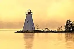 In 1819, Lt. James Duffus (half pay Naval Officer), whose brother-in-law was Sir Samuel Cunard founder of the Cunard Line of steamships, founded his home on what is now Kidston Island.[2] Duffus operated a mercantile business on the island, serving people from River Baddeck and Grand Narrows; customers were ferried to the island by canoe.[2] Duffus died in 1833, and his former assistants operated the business for a little over two years.[2] In 1836 the executors of his estate in Halifax sent William Kidston to wind up his business.[2] Kidston met and ended up marrying Margaret Ann Duffus, widow of James Duffus, in 1836 and taking over the business. The Kidston business was moved to the mainland in 1840. A lighthouse was built on Kidston Island in 1875.[3] The present lighthouse was built in 1912 and the two stood side-by-side for some time. Eventually the island came to be owned by the Mersey Paper Company which sold it to the Village of Baddeck in 1959.
