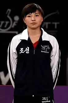 Kim Jong Ping (born 19 April 1989, South Hamgyong Province) is a North Korean table tennis player.[2] She competed for North Korea at the 2008 and 2012 Summer Olympics.[3] At the 2008 Olympics she competed in the women's singles only, and at the 2012 Summer Olympics she competed in the women's singles and the women's team events.[2] She won gold medals in mixed doubles events with Kim Hyok-bong at the 2013 World Championships and the 2014 Asian Games.