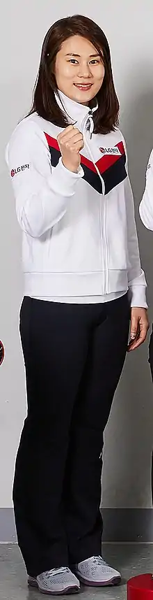 The 2018 Olympic curling team of skip Kim Eun-jung, vice Kim Kyeong-ae, second Kim Seon-yeong and lead Kim Yeong-mi, coached by Peter Gallant of Canada and herself, received celebrity status for their strong performances despite entering the tournament as underdogs. Korea topped the round robin standings with just one loss while defeating heavily favoured Canada and Sweden, and then advanced to the final where they lost to Sweden to claim the silver medal.[4] The next month, the team then played in the 2018 World Women's Curling Championship where they lost in the quarterfinals.