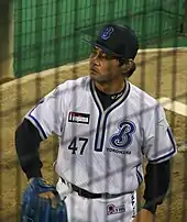 Kimiyasu Kudo (工藤 公康, Kudō Kimiyasu, born May 5, 1963) is a Japanese former professional baseball pitcher and the former manager of the Fukuoka SoftBank Hawks of Nippon Professional Baseball. Known for his longevity as a player, he holds the NPB records for longest career with 29 seasons played, most consecutive seasons with at least one win with 23 and is the oldest pitcher to strike out 10 batters in a game, doing so at the age of 41 years and 11 months. In his career, he recorded 224 wins, a 3.45 ERA and 2,852 strikeouts. However, despite all his accolades, he is infamously known for having never won the Eiji Sawamura Award, given to Japan's top pitcher.