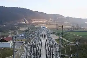 The plan as of mid-1994 was for an overtaking loop that could be developed into a regional station if required. North and south of the station four sets of points were planned, allowing changes between each track.[6] In 1999 it was decided to build a local station at the request of the state of Bavaria.[7]