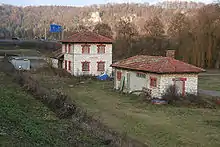 There is no entrance building at the station. The only building at the station houses a unit of the line's electronic interlocking system.