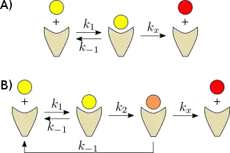 Comparison between a classical mechanism of molecular interaction (A) and a kinetic proofreading with one step (B). Due to the added reaction labelled in orange in (B), the production rate of the red bead is much more dependent on the value of which is the purpose of kinetic proofreading.
