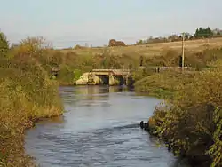 Westonzoyland village is a little further to the west, near where the Battle of Sedgemoor was fought in 1685.[28] The drain passes close to the village, and then turns to follow a more northerly course, with bridges carrying minor roads at Parchey, with Chedzoy slightly further west, and at Bawdrip, which is to the north-east of the Drain. At Crandon Bridge the A39 road crosses the Drain to a 'T'-junction with the old course of the A39 to Glastonbury and the newer A39 spur to the M5 motorway. Passing to the south of Puriton, it turns first west and then south-west as it passes under the M5 motorway, the Bristol and Exeter Railway, and the A38 road in quick succession, to reach the River Parrett at Dunball clyse.[29]