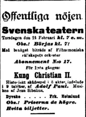 An 24 February 1898 advertisement in Nya Pressen promoting Jean Sibelius's incidental music to King Christian II