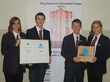 In September 2005 the school achieved Specialist school status as a Humanities College and renamed yet again, this time to King Edward VI Humanities College. The additional funding provided an audio and visual recording studio, enhanced ICT facilities and an archive area in a recently refurbished Humanities Block with interactive whiteboards and well resourced departments.[5] The school has provided sixth form education for the over 16s since September 2008, with provision of study for a BTec National Diploma Studies in Business Studies. Although the specialist schools programme has now ended the school continues to specialise in humanities.