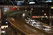 As originally constructed, the bridge had eight lanes across the Yarra River, two through lanes in each direction connecting King Street to Kings Way, in addition to two lanes on each side that connected to Yarra Bank Road. At the south end north facing on and off ramps connected to Whiteman Street, and the running lanes from the viaduct descend to ground level, with tram route 58 emerging from City Road to the median strip.[1] In the 1990s, the development of Crown Casino closed Yarra Bank Road, and the bridge ramps were connected to the basement carpark of the complex.[2][3]