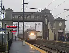 - ↑ Attleboro, T. F. Green Airport, and Wickford Junction are also located on 150 mph (240 km/h) sections, but these stations have platform tracks not normally used by the Acela.