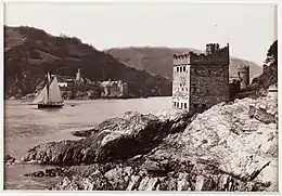 In 1855, the businessman Charles Seale Hayne restored Kingswear to form a summer house, using the local architect Thomas Lidstone; the ground floor was redesigned, a conical roof added and a detached round tower constructed on the north-west side.[16] During the Second World War, it was used by the Royal Marines and the site reinforced by a concrete blockhouse.[8] In 1955, the castle was bought by Sir Frederic Bennett, newly elected as Member of Parliament for Torquay (and afterwards for Torbay), who turned it into a private residence and his constituency base. Following his retirement from politics in 1987, Sir Frederic sold the castle to The Landmark Trust who converted it for use as a holiday let, restoring the ground floor of the main building to its original appearance and recreating the earlier flat, lead roof.[17] It is protected under UK law as a Grade I listed building.[5]
