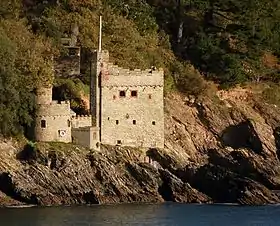 Work on Kingswear began in 1491, with the intention of providing protection to the east side of the estuary, and by the time it was completed in 1502 it formed one of the first purpose-built artillery forts in Britain.[4] It took the form of a three-storeyed, square tower built of slate rubble with red sandstone detailing.[5] Its large, rectangular gun-ports with wooden shutters on the ground level matched those at Dartmouth Castle, and looked out close to the water at the entrance to the harbour, covering both the sea and the anchorage itself.[6] The first floor would have also held guns and provided accommodation for the garrison.[7]