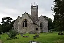 The Church of England parish church of St Michael is Grade II* listed.[13][14] The rubble stone church has a west tower and a small chancel; in between, the nave and the wide north and south aisles each have a gabled roof.[13] There is evidence of a 12th-century church in the wide chancel arch (much restored) and in the jambs of the south doorway, which have carved capitals.[15][16]