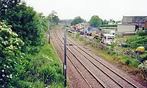 Trains pass at speed on the electrified West Coast Main Line. The station platforms have been demolished, the pedestrian overbridge is still present and the main station buildings survive as private dwellings. The Station Inn still stands nearby.