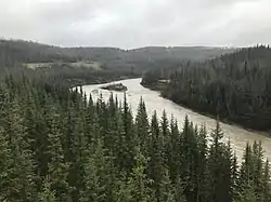 Bearhole Lake Provincial Park and Protected Area is established around the headwaters of the river, and One Island Lake Provincial Park is located on the beginning course. The Kiskatinaw Provincial Park is established on the mid course of the river, east of the Alaska Highway, along the old alignment of the highway, at the site of a curved wooden bridge.[2] This bridge was constructed with the Alaska Highway during the Second World War. Its curved design strategically helped prevent attacks from bombs. Due to its hairpin curve, completion took nine months.[3]