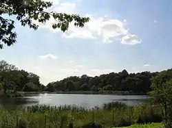 Kissena Lake was part of a watercourse called Kissena Creek, previously known as Mill Creek or Ireland Mill Creek, which ran east-to-west through what are now Kissena Park and Kissena Corridor Park.[19]: 109 [22]: 97−101 The creek began at a swamp in the modern Kew Gardens Hills and Pomonok areas south of Kissena Park.[19]: 109 [24] Past the swamp, the creek traveled east parallel to 72nd Avenue,[19]: 109 [25] then turning north in modern Fresh Meadows, traveling parallel to today's Utopia Parkway to the modern Kissena Park Golf Course just south of Flushing Cemetery.[19]: 110–111 [22]: 96−101 [26] The creek then turned west through the modern Kissena Park, Kissena Corridor Park, and Queens Botanical Garden sites before meeting Flushing Creek at what is now the Fountain of Planets / Pool of Industry in Flushing Meadows.[19]: 115 [22]: 96−101 The system included several lakes, including Kissena Lake, as well as a pond in Fresh Meadows now occupied by the Utopia Playground.[19]: 110 [26] The system of waterways was mostly a wetland area.[3]: 6