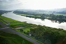 The Kitakami River (北上川, Kitakami-gawa) is the fourth largest river in Japan and the largest in the Tōhoku region. It is 249 kilometres (155 mi) long and drains an area of 10,150 square kilometres (3,920 sq mi).[1] It flows through mostly rural areas of Iwate and Miyagi Prefectures. The source of the river is the Mount Nanashigure in northern Iwate, from which it flows to the south between the Kitakami Mountains and the Ōu Mountains.[1] The river is unusual in that it has two mouths, one flowing south into Ishinomaki Bay and the other flowing east into the Pacific Ocean, both in Ishinomaki City.